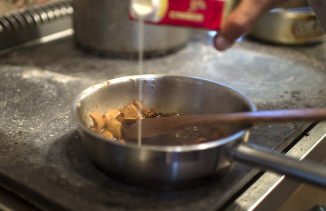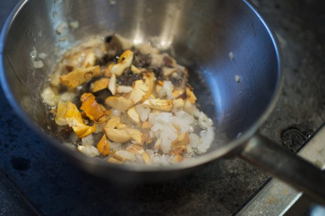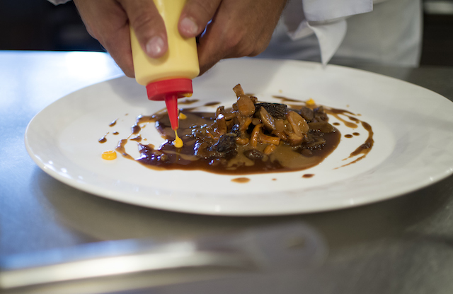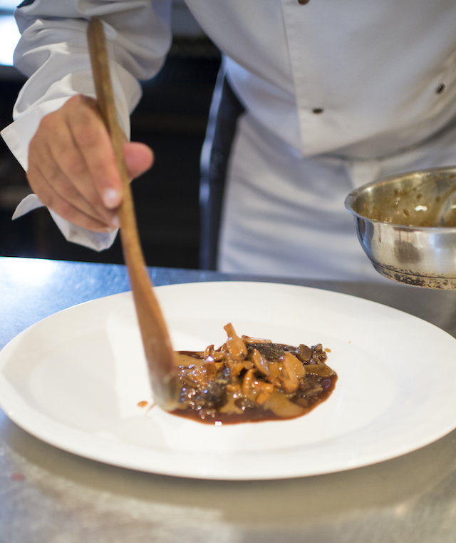 Для соуса: обжариваем лук-шалот, добавляем каштановый мед, карамелизируем, добавляем немного бальзамического уксуса. Немного каштанового бульона и вареных каштанов. Упариваем, добавляем концентрированный бульон из говядины и трюфельную пасту. Отдельно тушим грибную смесь — здесь подойдут любые грибы. Заливаем соусом, и готово.