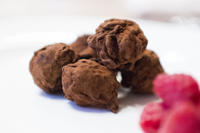 Шоколадные трюфели округлой формы с начинкой из ганаша приобретаем в лучшей кондитерской и подаем со свежей малиной вместе с любимым чаем.