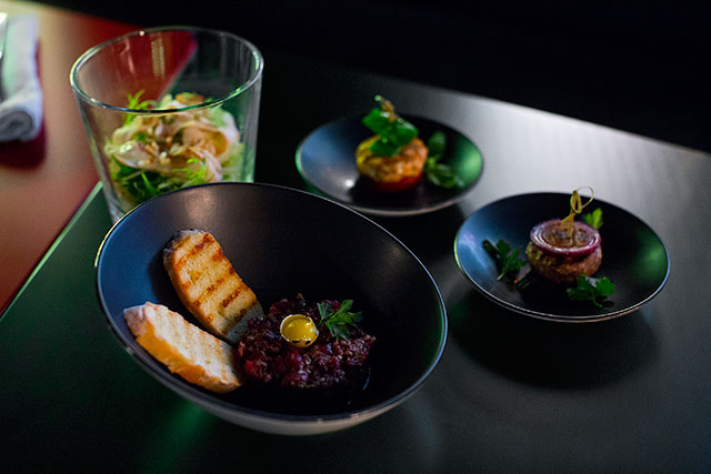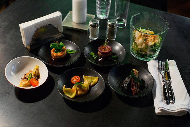 Придумывая меню, шеф Мариано Валерио отталкивался от идеи барной еды, которая должна: 1) быть компактной; 2) не обременять едока размером тарелки и необходимостью пользоваться ножом-вилкой; 3) не привязывать гостя к конкретному месту; 4) быть устойчивой к качке, неминуемой в морском баре. Бутерброды и прочие тапасы для шефа Bosco café и ресторана Barlotti оказались мелковаты, и он нашел невероятное в своей простоте и изяществе решение. Штучная паста и горячие блюда. Не фуршет, не канапе на укус, а полноценное блюдо с гарниром. В формате унико — так назвали эти блюда — доступны паста и горячее (шашлычки и котлетки). В пасту Валерио заворачивает начинки (карбонара, бекон и томатный соус, морепродукты, брокколи и сальсичча, утиное рагу) и отдает поштучно за 100 рублей. Можно и все вкусы попробовать, и съесть ровно столько, сколько хочется. Карбонара получается просто невероятной, с жидким желтком. Для этого Валерио использует замороженные пастеризованные (чтобы избежать даже возможности сальмонеллеза) желтки. Горячие унико идут по 120 рублей: говядина, цуккини, болгарский перец; ягненок, красный лук, баклажан; курица, тыква, шампиньон; кролик, морковь, свекла; лосось, помидор, шпинат; осьминог, картофель, артишок. Плотные, хорошо жующиеся котлетки лишены крахмала, муки, яиц и любых других связующих добавок (чистый белок!) и подаются на увесистых кружках овощей. Непременно стоит заказывать телятину алла миланезе (150 руб.). Салаты (с осьминогом и воздушным рисом (450 руб.), рулет из кролика с бальзамиком (450 руб.) подают в больших стаканах-вазонах. Эта идея тоже подчинена принципу мобильности, с таким салатом можно легко передвигаться по залу. Придуманные Валерио унико идеальны не только для быстрого перекуса, но и для длинных застолий — блюда на столе постоянно свежие, только что приготовленные на кухне. Принцип суши-робота, позволяющий попробовать хоть все меню, не беспокоясь о сумме чека, дополняют блюда классического формата.