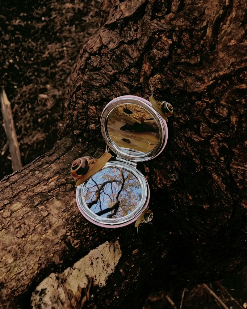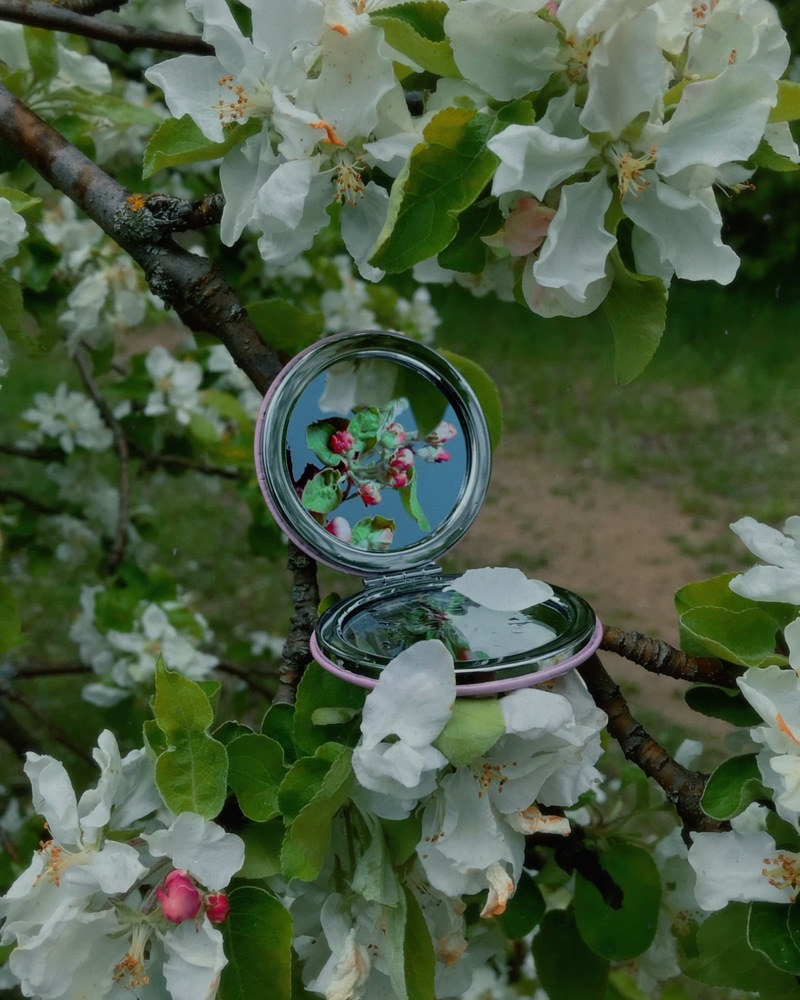 Во время локдауна в 2020 году я создала серию работ под названием «Зеркало». Это небольшие зарисовки, сделанные с помощью карманного зеркальца. В отражении зритель видит то, что оказалось за пределами объектива воображаемой камеры, — небо, цветущую яблоню, улиток и настоящий волшебный лес.