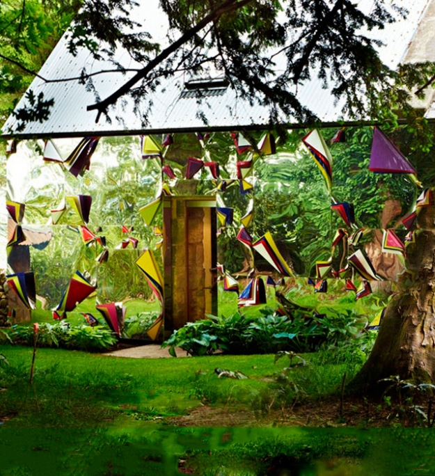 Среди работ Джима Лэмби нам особенно приглянулся блестящий ангар под названием "A Forest", впервые представленный в саду Юпитер (Jupiter Artland), что находится в поместье Боннингтон, в нескольких милях от Эдинбурга. Это сооружение Лэмби покрыл хромированными зеркалами, которые отслаиваются от стен. Кажется, можно потянуть за любой угол, и они с легкостью отклеятся. С обратной стороны эти листки окрашены в ярко-желтый, фиолетовый, ультрамарин и другие яркие цвета.