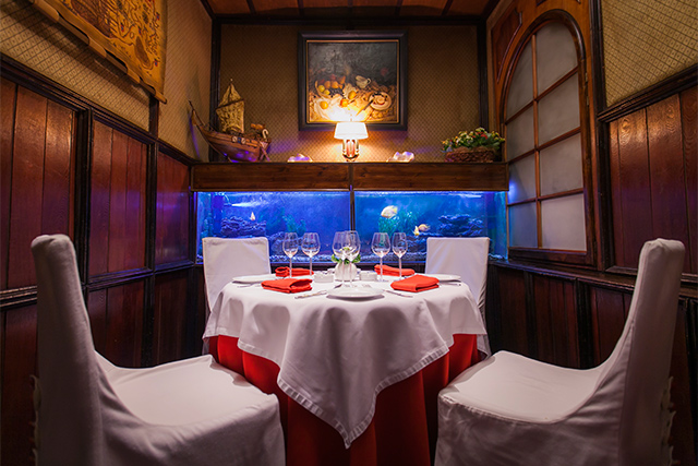 Первый ресторан Аркадия Новикова и первый рыбный ресторан Москвы. Напоминающий подводную лодку капитана Немо интерьер для сегодняшнего дня темноват, но кухня безупречна, а обслуживание превосходно. Первый зал украшен большими аквариумами, второй известен знаменитым стеклянным полом, под которым плавают живые карпы и осетры. В меню — все лучшее, что может предложить человеку море: от барабульки, лангустинов и тюрбо до живых крабов и омаров. Ради йодистых фин-де-клеров, жилардо со вкусом морской волны, замечательной, солоноватой кайпары, более постных, чем средиземноморские, курильских, но с той же легкой вязью в послевкусии устриц сюда приходят многие. Меню внушительное настолько, что кажется собранием проверенных хитов за два с лишним десятилетия плавания. Цены соответствуют. Чтобы упростить жизнь и обойтись малой кровью, берите к устрицам ежемесячный гастросет шеф-повара Алексея Горевого (1 500 руб.). До 10 января в него входит тартар из мурманского лосося с каперсами и мягким сыром, прадедушка рассольника — рыбная калья с красной икрой, ризотто с утиной ножкой и «Наполеон».