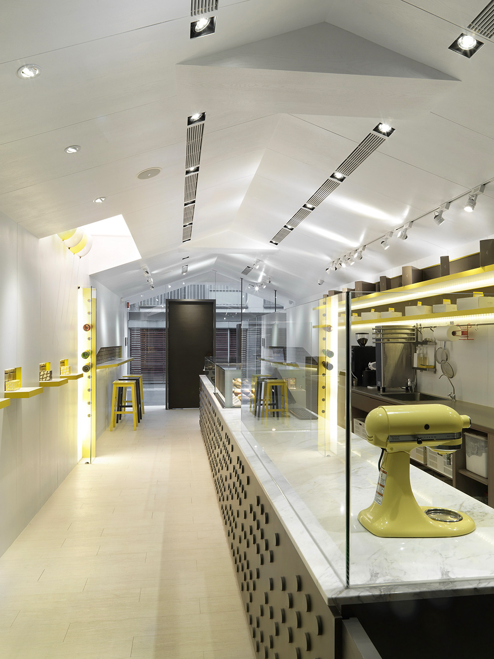 Желтый цвет сыграл ведущую роль в интерьере. Панели полок, сами полки, кухонные приборы, коробочки для сладостей и даже ручка на входной двери выкрашены в ярко-желтый цвет, который вызывает прямые ассоциации с солнцем. Оно, судя по национальному флагу Тайвани, является одним из символом острова.