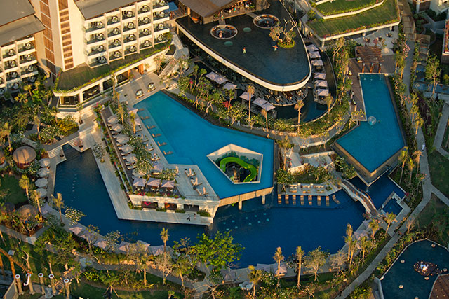 Первое, что отличает курорт Ayana, расположенный на юго-западе Бали, возле рыбацкого поселка Джимбаран, — это, конечно, его масштабы. Огромная, а точнее попросту необъятная территория в 90 гектаров сравнится по размерам с крупным поселком городского типа. Только, к счастью, ничего городского здесь нет — каменные джунгли заменяют джунгли тропические, а на самом краю этих пышных лесов — каменный обрыв и головокружительный вид на Индийский океан.