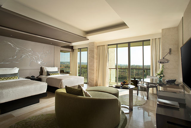Концептуальным Rimba выглядит не только снаружи, но и внутри. Гостям предлагают большие вместительные номера, интерьер которых всячески сигнализирует вам о том, что здесь поработала рука дизайнера. Светлое пространство венчает роскошная кровать с изголовьем, украшенным причудливым рисунком, а напротив стоит изогнутый диван, который непременно хочется увезти с собой домой. Лежа в круглой ванне, вы можете наблюдать за происходящим в номере и на улице, а в элегантной стильной гардеробной играть в мини-гольф. Да, размеры номеров в Rimba гигантские, как и сама территория вокруг него, — кажется, что живешь не в общем здании, а на частной небольшой вилле.