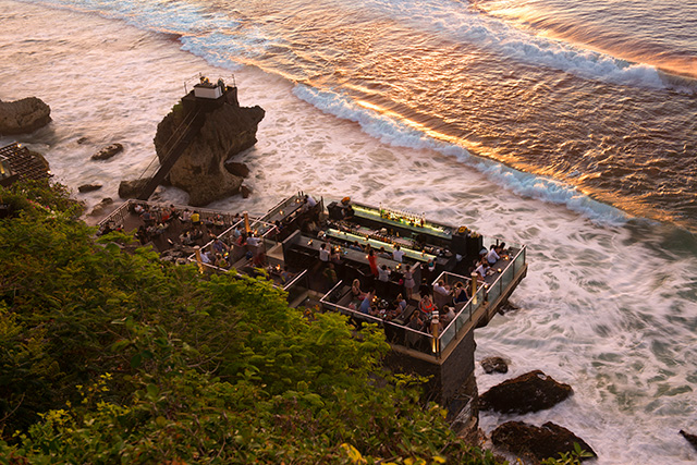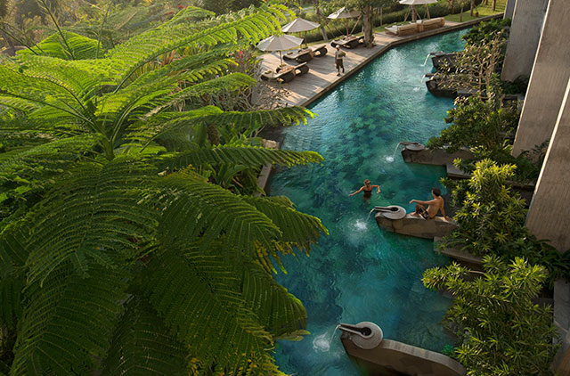 Архитекторы Rimba хотели добиться эффекта многоуровневой водной среды — шесть местных бассейнов связаны между собой сетью водопадов, фонтанов и ручьев. Вода здесь повсюду, она сопровождает вас во время прогулок, отдыха и приема пищи. Где-то она спокойна и безмолвна, где-то весело журчит, а где-то грозно, с оглушительным шумом разбивается о прибрежные скалы. Так, например, происходит в Rock Bar — местном специалитете, притягивающем людей со всего острова. Заведение расположено прямо на отвесной скале над океаном, откуда до посетителей долетают соленые брызги. Не попасть сюда хотя бы раз — просто преступление, ибо более живописного и романтического бара вы на Бали не найдете.