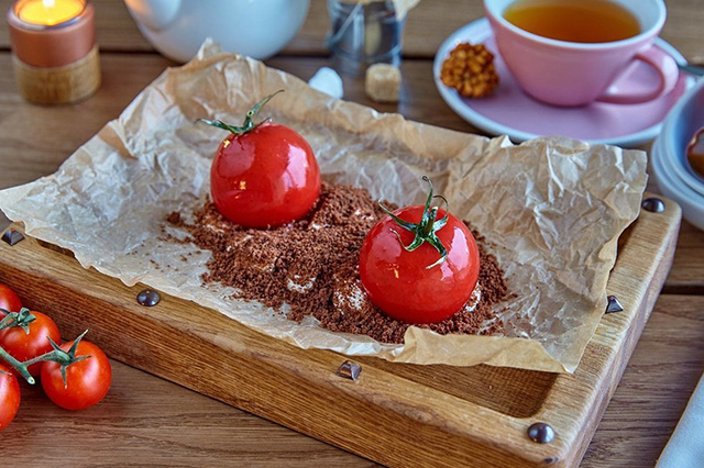 Грузинка Изо Дзандзава помимо главных кулинарных хитов своей родины всегда находит блюда, редкие для ресторанов даже в самой Грузии. Для «Двора Помидора» она придумала фирменное «помидорное» меню. Черри запекает для салата (310 руб.) и подает с ореховой пастой (похоже на соус «бажи», который используется в сациви); в томатном супе-пюре помидоры варит с другими овощами и протирает на итальянский манер (320 руб.); хачапури предлагает в сочетании со свежими помидорами, луком и тархуном (380 руб.); заворачивает вяленые томаты в рулет с индейкой, сулугуни и травами (490 руб.); для любопытных гурманов нашла редкое название «чвиштари» (360 руб.) — это запеканка вроде мамалыги или поленты, но из манки, с сулугуни, томатами и фаршем куриной печени. Но в список бестселлеров, наряду с хинкали (100 руб. за штуку), харчо (350 руб.) и шашлыками (410—980 руб.), попадают обычные помидоры, фаршированные по-домашнему мясом и рисом (480 руб.). Главный же чемпион местного Instagram — десерт «Помидори» (390 руб.), в котором нет ничего томатного, но формами с ботанической точностью он повторяет два спелых помидора.