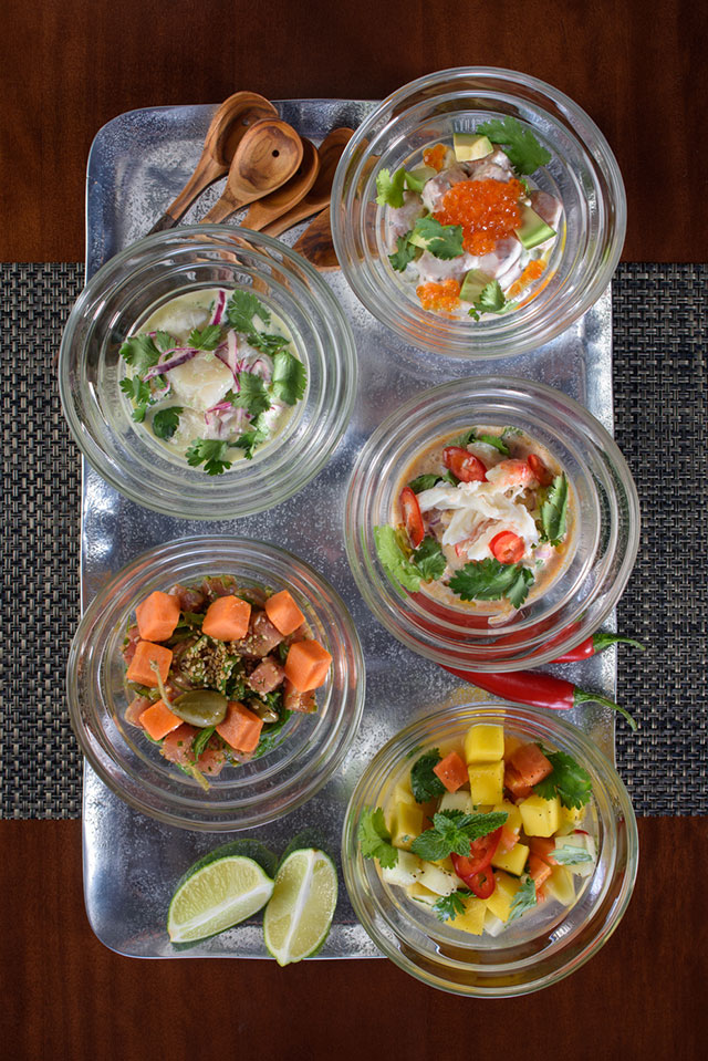 Они готовят более двадцати видов севиче и тирадито — традиционное перуанское блюдо из сырой рыбы с добавлением различных маринадов на основе лайма: лосось, желтохвостик, осьминог с пастой из желтых перцев, сибас, тунец с трюфельным маслом. Из севиче (сибас с бататом, антарктический чарт с тамариндом, сардины, черная треска, краб с кокосовым молоком) особенно выделяется севиче из гребешка с апельсиновой горчицей (480 руб.). Его, как и часть других севиче, подают в глубокой плошке — соус в этом блюде имеет первоочередное значение. Чтобы не превращать севиче в суп, к нему приносят ложку с дыркой: соус стекает — в рот отправляется сдобренный им гребешок.