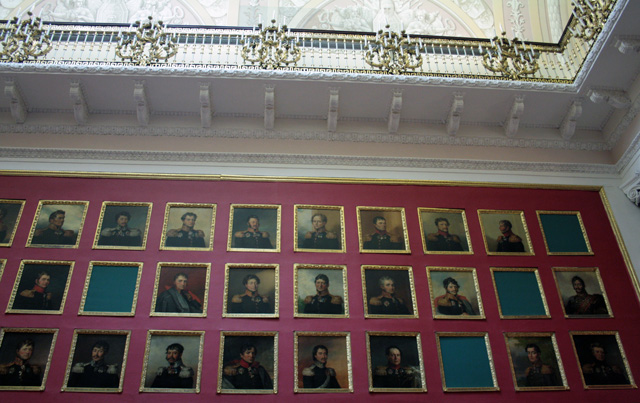 В портретной галерее "спрятан" проект Ясумасы Моримура — он точно не бросится вам в глаза, если бегом пробежаться по залу. Японский художник убрал со стен Эрмитажа портреты, которые отсутствовали во время Второй мировой войны (в то время более миллиона произведений из коллекции музея были эвакуированы), и на их месте оставил лишь зеленую ткань. Приглядевшись, обнаруживаем, что таких полотен было немало.