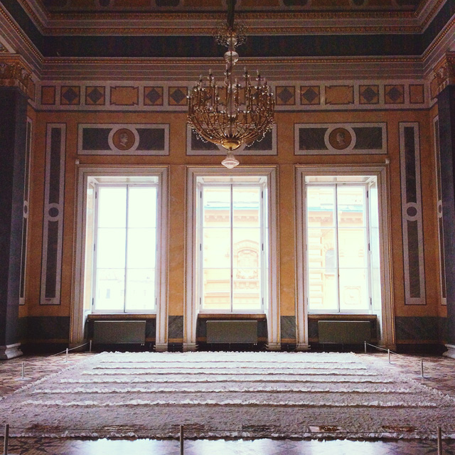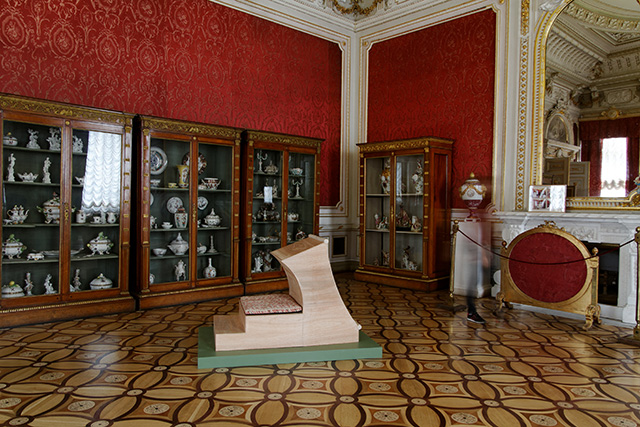 На том же втором этаже Зимнего дворца вы найдете скульптуру шотландской художницы Карлы Блэк. Ее хрупкие, кажущиеся эфемерными работы созданы из натуральных и синтетических порошков, косметических средств, красок, гипса и бумаги. В Двенадцатиколонном зале Эрмитажа художница представила скульптуру "Узнаваемая оборона": она расстелила ее на мозаичном полу музея, словно ковер, достойный покоев императрицы.