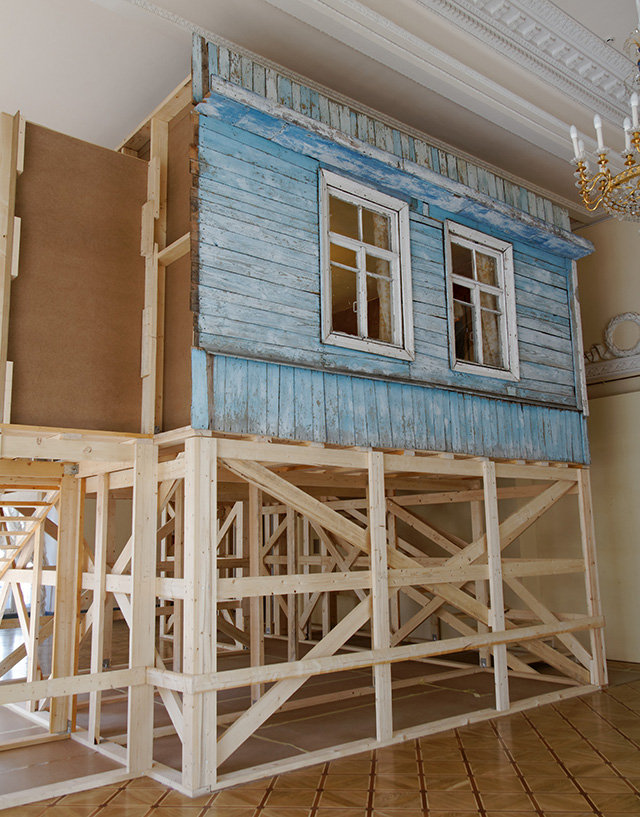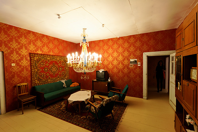Поднявшись по красным ковровым дорожкам главной лестницы Эрмитажа, пройдите пару залов и тут же найдете дом работы японского художника Тацу Ниси, который занял целую комнату. Внутри деревянной конструкции скрываются интерьеры 70—80-х годов — такие кресла с деревянными подлокотниками, "серванты" с хрусталем и поздравительными открытками, заботливо вставленными под стекло, еще можно увидеть во многих российских домах.
