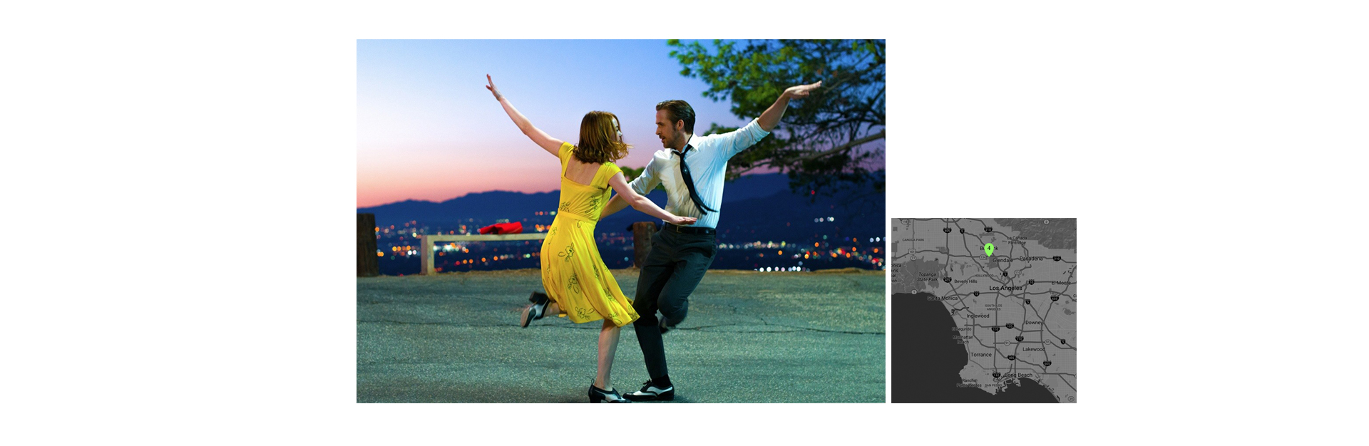 После шумной вечеринки у бассейна герои оказываются в парке около обсерватории Гриффита, поют песню «A Lovely Night» композитора фильма Джастина Хервитца и танцуют в ботинках для чечетки. На самом деле это место не совсем парк: здесь нет ни скамейки, ни фонарей, — все это специально привезли для съемок. Но открывающийся из этой точки вид действительно многого стоит.