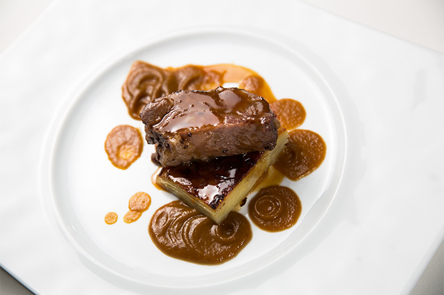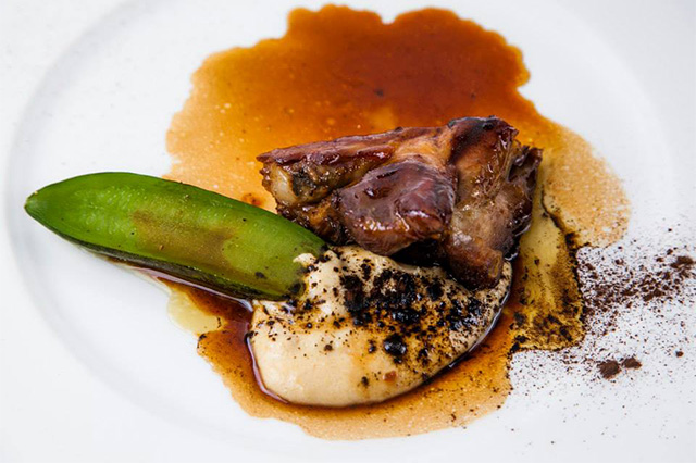 ХРУСТЯЩИЕ ТЕЛЯЧЬИ ЩЕЧКИ С МИЛЬФЕЕМ ИЗ КАРТОФЕЛЯ И ЗЕРЕН ГОРЧИЦЫ СТОИТ СОПРОВОДИТЬ ИСТОРИЕЙ ОБ ОТЦЕ ЭНРИКО — CАПОЖНИК, ОН ЧАСТО ПОЛУЧАЛ СЫРЫЕ ТЕЛЯЧЬИ КОЖИ С ГОЛОВОЙ, МЯСО С КОТОРОЙ СНИМАЛОСЬ И ДОЛГО ВАРИЛОСЬ НА СЕМЕЙНОМ ОЧАГЕ