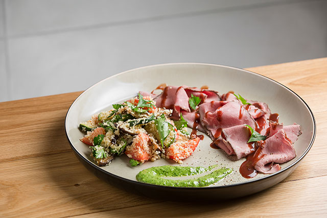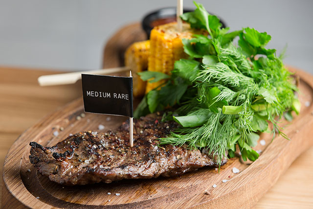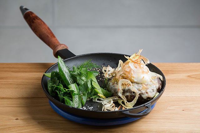 Описывать брянского ангуса так же бессмысленно, как жаловаться на погоду, — альтернативы в мясных ресторанах практически нет, и все знают его на вкус и на цвет. Классических стейков в Hitch всего четыре (1 590—2 900 руб.), их заказывают и из мяса сухого вызревания. В разделе «Гурме» значатся три альтернативных отруба. «Флэт Айрону» (590 руб.) рекомендуют прожарку medium rare. Багровый срез показывает точность обжарщика, но к мяснику есть вопрос. При классической нарезке лопаточной мышцы жила остается снаружи и обрезается, а здесь она почему-то внутри. Зато веганы счастливо избегают ловушек, заказывая стейк из цветной капусты (290 руб.).