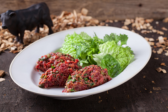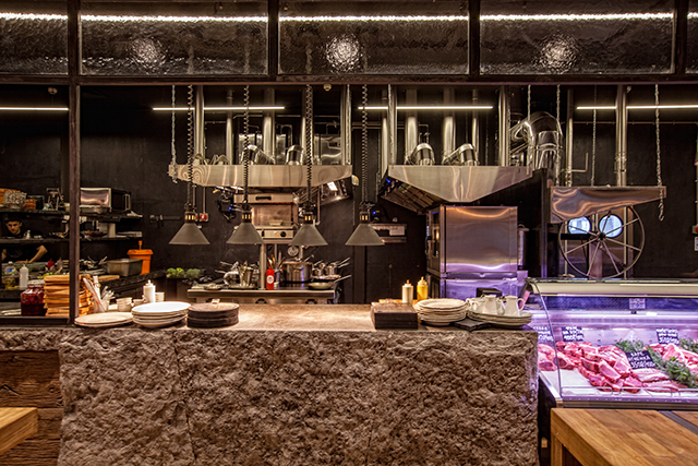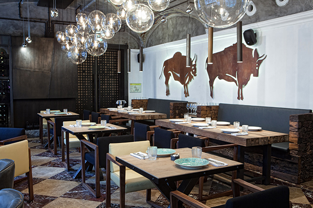Мозаики в потолке сверкают винтажным стеклярусом, за столы усаживаются то модные парочки, то измученные столичным нарзаном иностранцы, то господа в костюмах. Они редко поднимают головы на графические листы Дэмиена Херста с черепами, картины Алексея Васильева или деревянное панно в индийском стиле с роботом Бендером в главной роли. Все, что интересует в данный момент эту разношерстную публику, — это жир, жир и еще раз жир. Это слово в разных вариантах повторяют тем, кто пристально изучает меню. Говядина блэк ангус категории прайм зернового откорма постной не может быть по определению. Именно благодаря жиру появляется та самая мраморность мяса, которая позволяет куску мяса превращаться в тающий во рту, насыщенный мясным ароматом, легко режущийся стейк. Ради таких стейков и затевался «Рыбы нет». В меню их восемь. По настоянию бренд-шефа Камеля Бенмамара самые популярные — рибай на кости и стриплоин на кости — назвали соответственно чулетон (490 руб. за 100 грамм, куски нарублены от 400 грамм) и чулетино (440 руб. за 100 грамм, куски нарублены от 400 грамм). Из альтернативных отрубов предлагают маринованную диафрагму (скерт стейк, 800 руб.) и лопатку (топ блейд, 800 руб.). Самый постный кусок — рибай чойс (560 руб. за 100 грамм). Повара говорят, что мясо такого качества невозможно испортить. Увы, три из шести заказанных стейков по дороге от гигантского четырехтонного гриля к столу дошли на тарелках и вместо того самого нежного и тающего превратились в заурядный кусок, не стоящий своих денег. Не меньшее разочарование — овощи на гриле (450 руб.) на гарнир. Ровно три кружочка баклажана, половина помидора и несколько лепестков красного лука. Скупо, сухо, лапидарно.