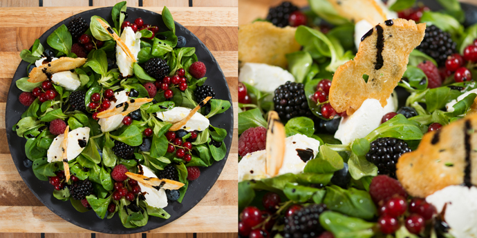 Корн салат с лесными ягодами и сырным соусом
