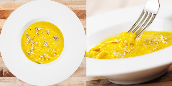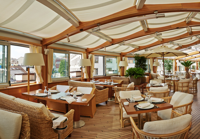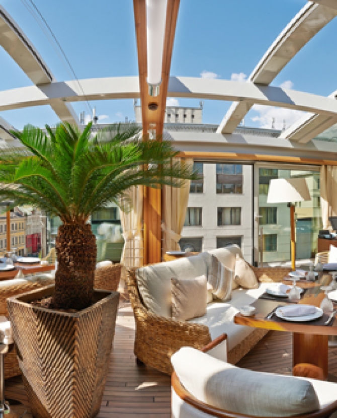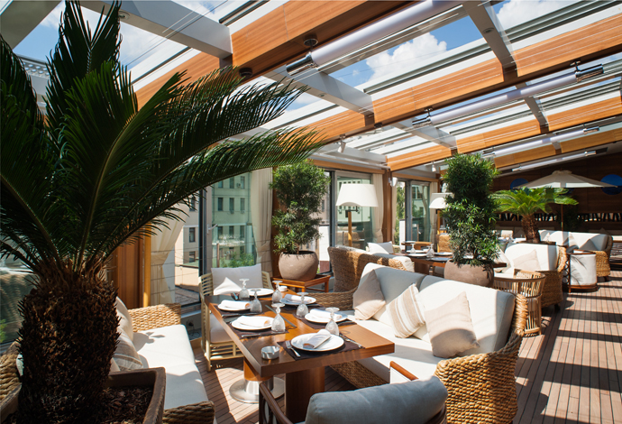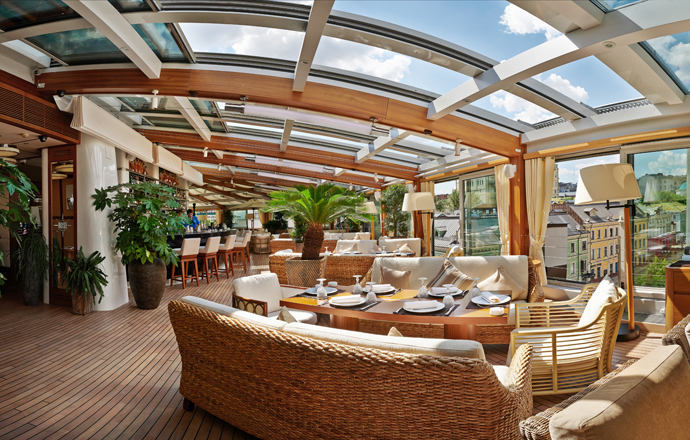 Здесь действительно нет сложносочиненных конструкций и драматических нагромождений, все по нынешнему чину: довольно элементарный бар, по форме напоминающих спортивную лодку, несколько горшков с живыми цветами и деревьями, плюс эффектный специалитет — крыша-телескоп с раздвигающимися створками. Панорама звездного неба, историческое здание — все это прекрасно, но что же насчет кухни?