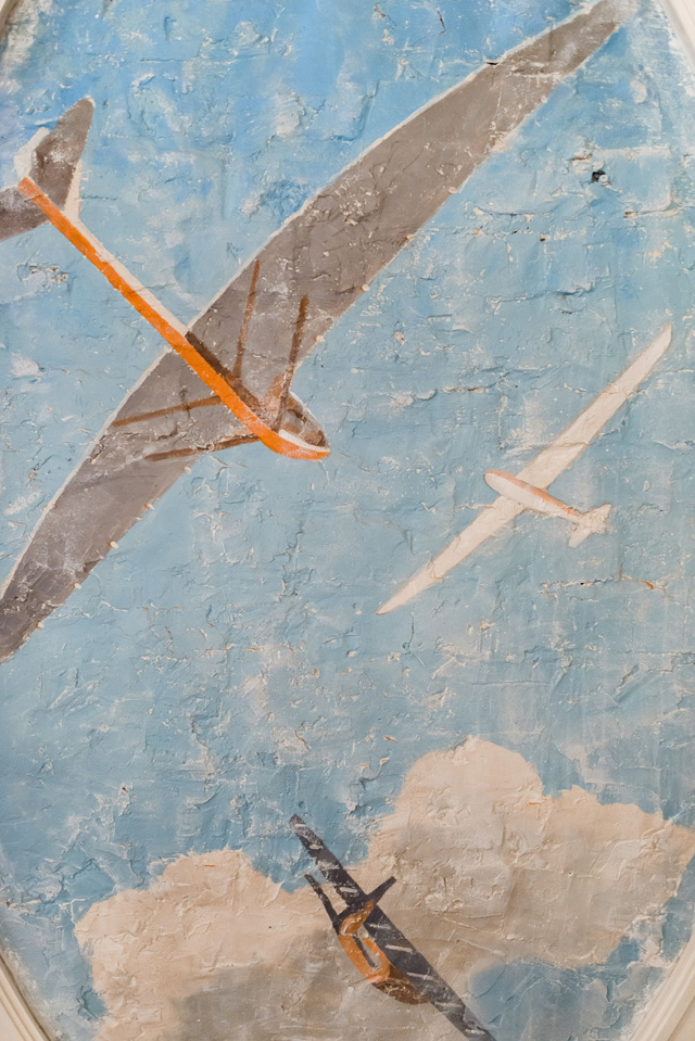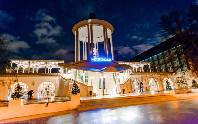 «Московское небо» находится в утомительных двадцати минутах пешком от главного входа на ВДНХ, в бывшем торговом павильоне треста «Главкондитер» (ныне № 422), похожем на свадебный торт. Соседи у «Главкондитера» славные — Дворец бракосочетаний и знаменитый «Гастроном», во время оно обслуживавший пайками владельцев служебных «Чаек», а ныне удачно воспроизведенный Михаилом Куснировичем в ГУМе под именем «Гастронома № 1». Здание было построено в 1954 году по проекту архитектора Александра Борецкого, ученика знаменитого Ивана Жолтовского. Крышу неоклассического здания с элементами модернизма украшает воздушная круглая ротонда, в центре которой расположена скульптура «Девушка с виноградом» (летом тут откроют бар, а на крыше  три летние террасы). С 1964 года в здании располагался Зал приемов Иностранного отдела ВДНХ, а в постсоветские времена оно было занято фанерными клетушками офисов. Зато сейчас опять сияет легким праздничным интерьером, украшенным удивительно похожими на мозаики «Маяковской» и картины Дейнеки фресками-стилизациями на темы неба и космоса, хрустальными люстрами и обтянутыми небеленым полотном французскими стульями в стиле Людовика XVI.