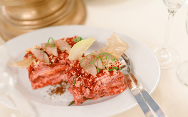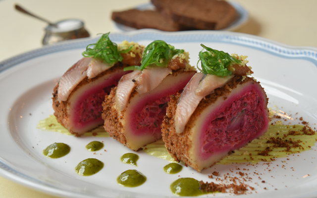 Под рок-боевик Александры Пахмутовой «И вновь продолжается бой» и хиты советских кинофильмов официантки в аккуратных платьицах с белыми передничками подают полное главных хитов знаменитой «Книги о вкусной и здоровой пище» меню. От селедки под шубой, студня, оливье, мимозы, чебуреков, грибной икры, бефстроганова ждать чего-то необычного сложно, но на то здесь и «новая советская» кухня, чтобы удивлять. Селедочную шубу сворачивают в рулет, а сверху выкладывают филе олюторской сельди (310 руб.); классический оливье наряжают хрустящим картофелем пай и ломтиками пряного, с отчетливым перцем в послевкусии пастрами (320 руб.); студень из говядины, телятины и курицы (290 руб.) прячется под салатом из овощей с грузинскими специями; в шедевральную мимозу (340 руб.) кладут собственного копчения лосося; спинку трески из Баренцева моря (510 руб.) запекают с деликатной хрустящей корочкой и подают с лимонно-сладким соусом цитронель и кускусом, на поверку оказывающимся птитимом, дальним родственником орзо. Огромный шницель по-московски (650 руб.) с яйцом пашот и жареной картошкой составляет достойную конкуренцию венскому шницелю и коттолетте алла миланезе. Чудовищному обаянию наполеона (310 руб.), медовика (250 руб.), черничного штруделя (330 руб.), сметанника (280 руб.), в котором нашлось место и шоколадному бисквиту, и черносливу, и паутинке из шоколада, нет никаких человеческих сил противостоять. Кухня готовит еще сладкие и сытные вертуты, пока не внесенные в меню, но обещающие стать непременной частью любого заказа. В феврале, говорят, от Ботанического сада пустят автобус, который будет проходить по территории ВДНХ и останавливаться аккурат рядом с «Московским небом», — вот тогда и полетаем всласть.