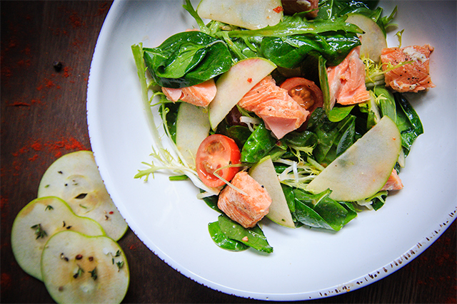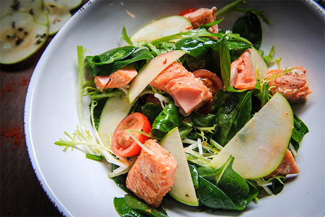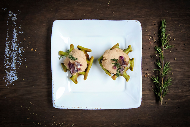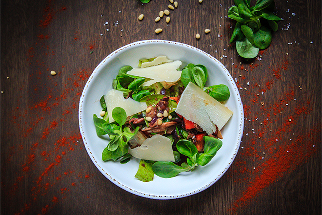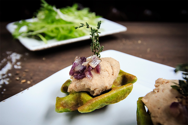 К вину предлагают салат из кольраби и пак-чой (325 руб.), заправленный наркотической смесью терияки и лайма, салат из кальмаров с томатами (450 руб.), зеленые вафли с неркой или паштет из утки (210 руб.). Выбирайте последний — он сдобрен бальзамиком и луковым мармеладом и глотать обычно тягучий паштет становится значительно веселее.