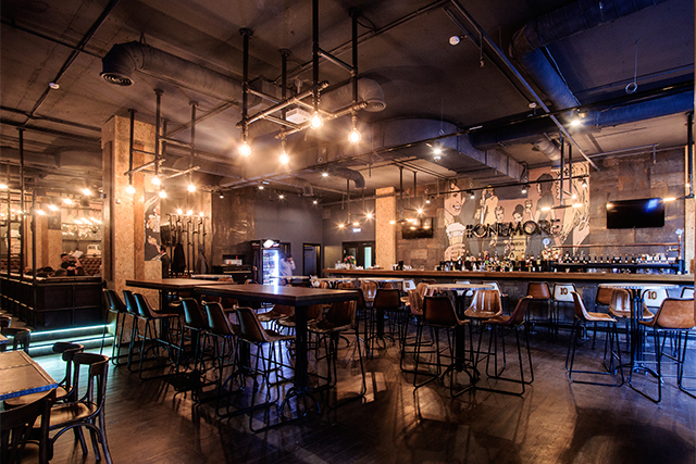 One More Beer & Wine нельзя назвать антипабом в полной мере этого слова — интерьер тут достаточно сдержанный и брутальный. Темные стены, отделанные ДСП колонны, высокие круглые столики с похожими на бейсбольную перчатку стульями, кожаные диванчики для более основательных посиделок и непременные экраны с почти неузнаваемой музыкой из начала 80-х и спортивными трансляциями — все это скроено по знакомым лекалам. По пятницам и субботам приветствуются танцы. На это намекает стойка диджея. Очевидное, простое место без налета модности для служащих ближайших бизнес-центров и бегущих по Садовому прохожих. Могло бы быть, если бы не меню. К его созданию привлекли заскучавшего несколько лет назад на должности главы кейтеринга «Bosco Банкет» и ушедшего на вольные хлеба консультанта Сергея Душкова.