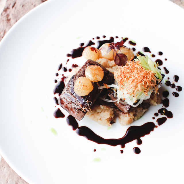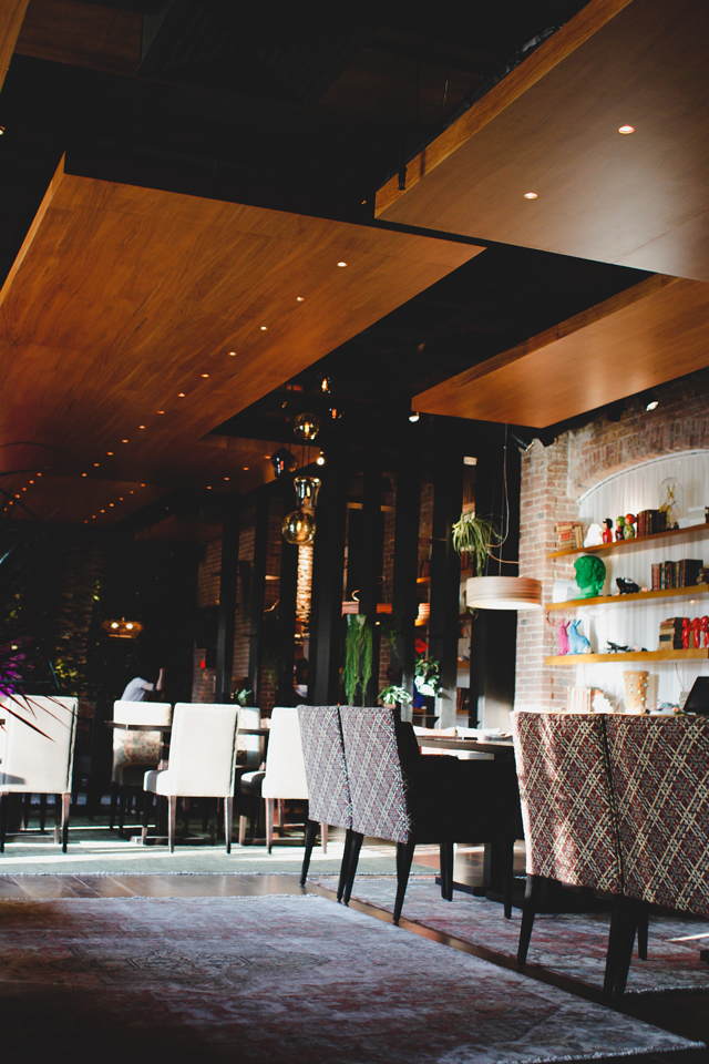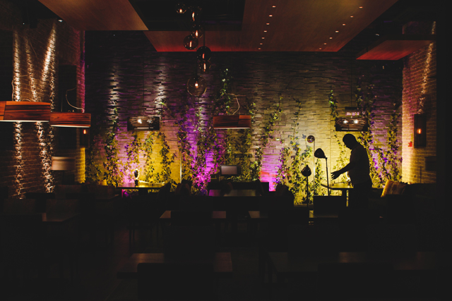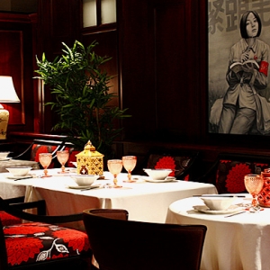 Приятным открытием стало именно оформление полумрачного, чуть вытянутого зала: даже с учетом пристального внимания самого Деллоса к каждой детали интерьера ресторан лишен привычных атрибутов пафоса — здесь нет ни позолоченных вензелей, ни старинных мозаик, ни накрахмаленных скатертей. Вместо этого мы видим сдержанный дизайн и большое количество современных декоративных элементов: статуэтки в стиле поп-арт, светильники а-ля Том Диксон, фотозанавески с изображениями лиц девушек и целую стену в виде живой изгороди.