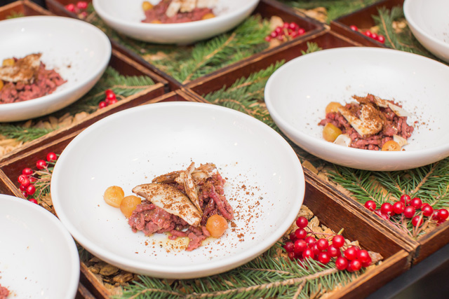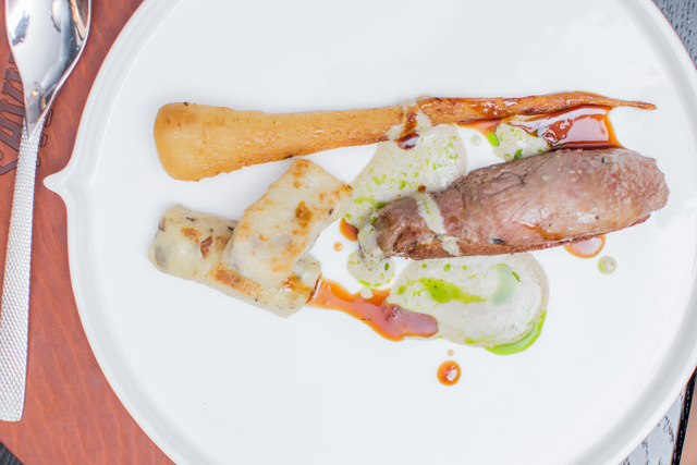 Далее следует тартар из оленины с маринованной антоновкой и свежими белыми грибами. Его шеф поливает жженым маслом. Еще горячее, оно «прихватывает» мясо, а остывая, добавляет ему особую нежность. Печеная картошка и жареная гусиная печенка становятся фаршем для равиоли в бульоне из шампиньонов и белых грибов с даси. Невесомый «снег» из печени и минеральной воды медленно тает на их желтоватых спинах. Засоленный и 16 часов томившийся в сувиде ягнячий язык становится основой кокота, который оттеняют сморчки в сливках и картофельный крем а-ля Робюшон.