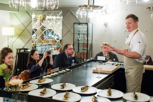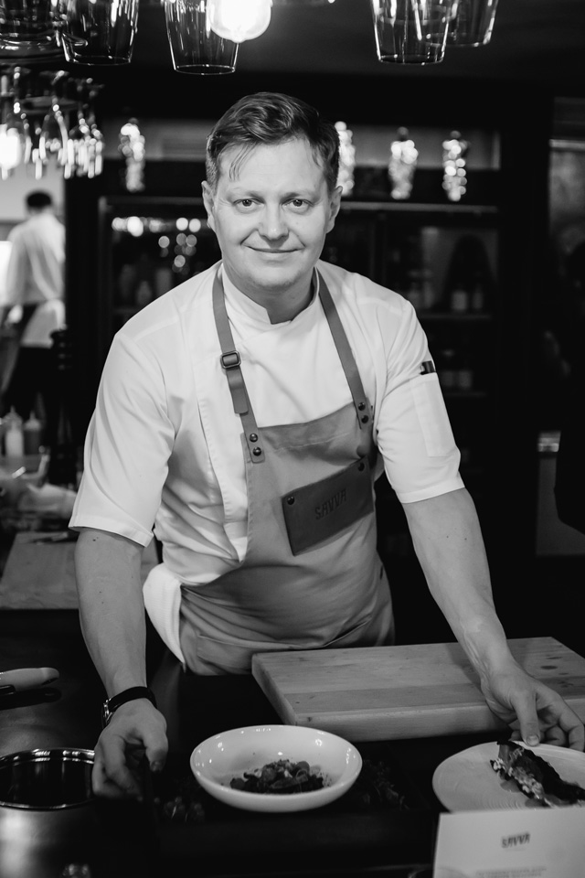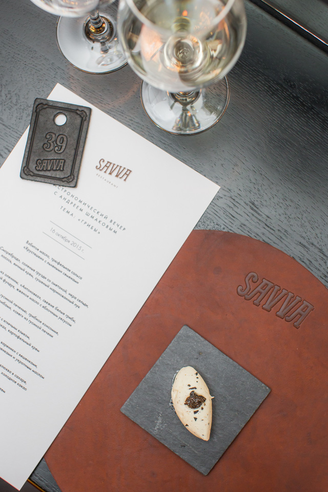 Для последних на втором этаже SAVVA устроили chef's bar, где Шмаков будет готовить по четвергам особое сет-меню. «Это не гастрономический спектакль, это вечер для знакомых и незнакомых друзей, пришедших ко мне в гости. У себя дома я готовлю друзьям что-то сезонное, простое: мидий в казане, запеченную на костре рыбу. Ну а поскольку сейчас на излете сезон грибов, то я решил приготовить для начала грибное меню», — поясняет свою идею Шмаков. Для повара, который учился готовить на камбузе рыболовецкого судна по двум книжкам, а потом названного прессой «магом эстонской кухни» (Андрей родом из Таллина), шеф-бар стал, с одной стороны, площадкой для экспериментов и работы над новыми блюдами, которые могут войти в основное меню ресторана, с другой — возможностью собрать впечатления от «подопытных кроликов», в роли которых настоятельно рекомендую побывать. О грибном меню Шмакова мнение однозначное: это гастрономическая бомба.