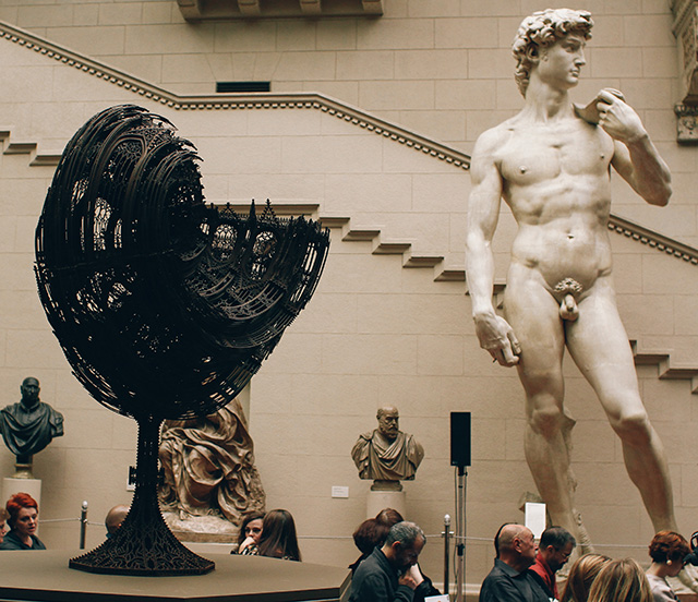 Представлены и более известные работы бельгийского провокатора — ироничные готические грузовики. Сам художник рассказывает, что тема машины для него — символ мужественности, первая игрушка мальчика. Тем интересней выглядит контраст тяжелой техники с ажурными взлетами готических форм. Материалы, которые использует художник, тоже не случайны.