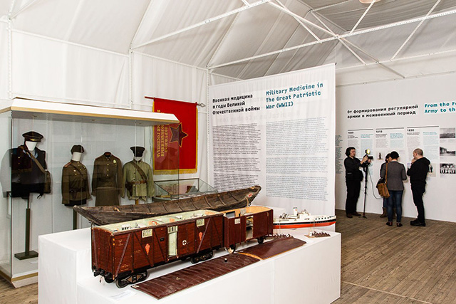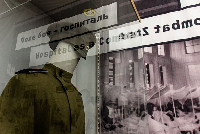 Для того чтобы увидеть другие проекты, углубляться в петербургские пригороды с благородным прошлым не придется: большинство площадок находится в центре города. Перед зарубежными дизайнерами стояла непростая задача — интересно подать довольно проблемный материал. Британское дизайн-бюро Barnbrook — один из самых "титулованных" участников биеннале — взялось за проект выставки "Поле боя — госпиталь" в Музее обороны и блокады Ленинграда. Место, отведенное под выставку, довольно тесное и к тому же проходное. А артефакты военных времен не такой благодарный материал, как, скажем, слоники и собачки Джеффа Кунса. Решая эти проблемы, дизайнеры задумали превратить пространство в импровизированную палатку в духе военно-полевого госпиталя.