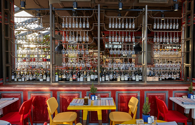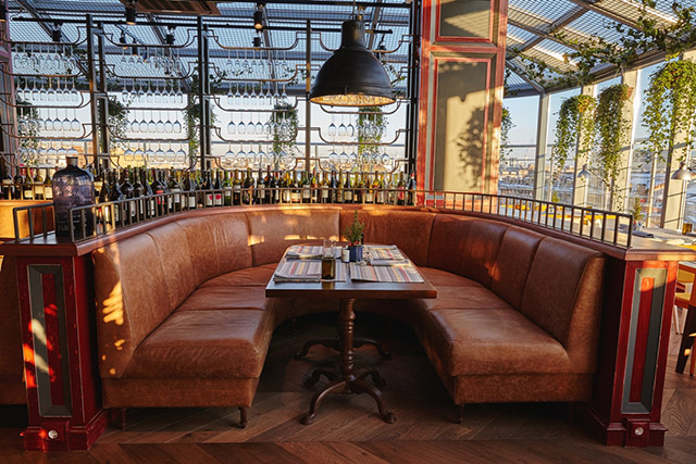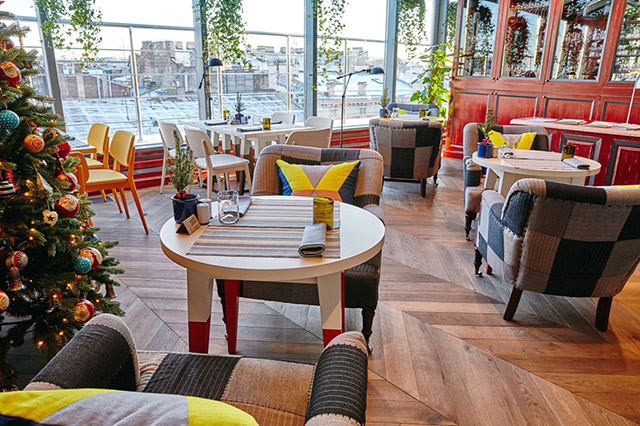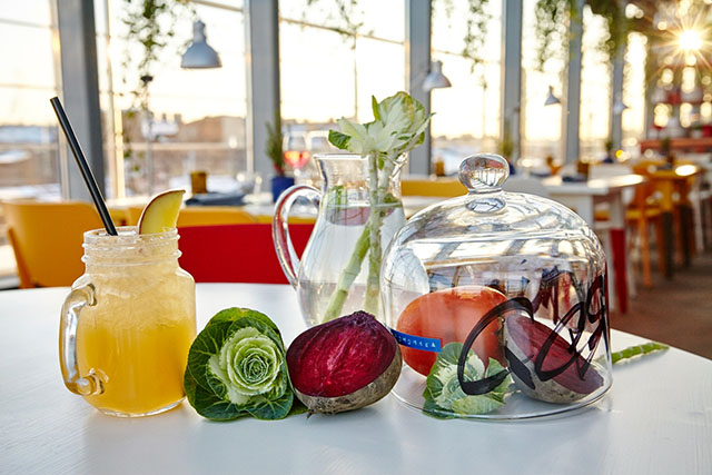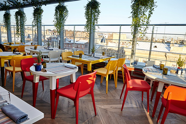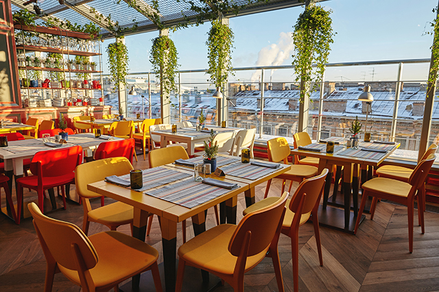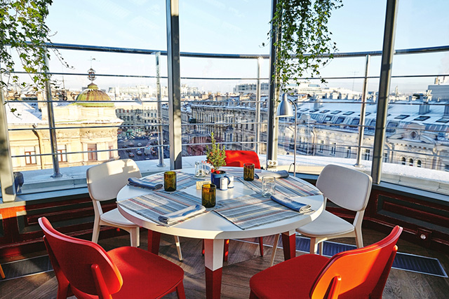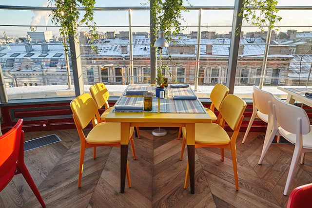 Все эти интересные блюда готовят на открытой кухне, протянувшейся вдоль огромного зала ресторана. Но, в отличие от некоторых концептуально похожих ресторанов Ginza Project, "Гастрономика" не кажется гигантом. Удачно зонированный зал похож на детский сад: столы и стулья разных цветов, много света и расставленная по полкам эмалированная посуда всех цветов радуги. Из больших панорамных окон открывается вид на крыши домов по улице Марата и оживленный перекресток с Невским проспектом, который словно обрублен зданием кинотеатра "Колизей". Сегодня ресторан работает лишь наполовину. Из двух запланированных этажей функционирует только один. К летнему сезону обещают открыть и второй, на котором обоснуется терраса.