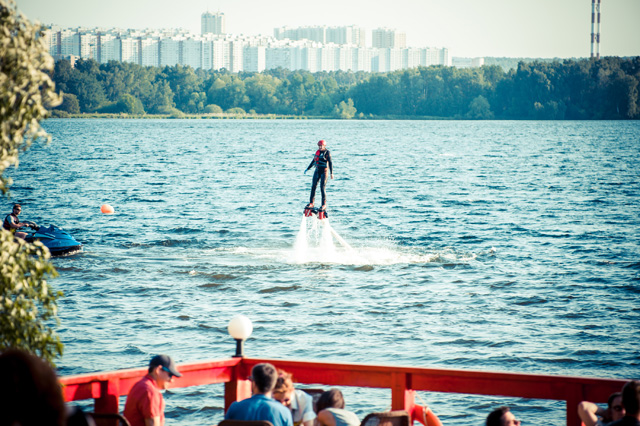 На берег Клязьминского водохранилища, в 5 км от МКАД по Дмитровскому шоссе, где находится яхт-клуб «Адмирал», можно приехать на машине, прийти на лодке и даже прилететь: у яхт-клуба имеется собственная вертолетная площадка.