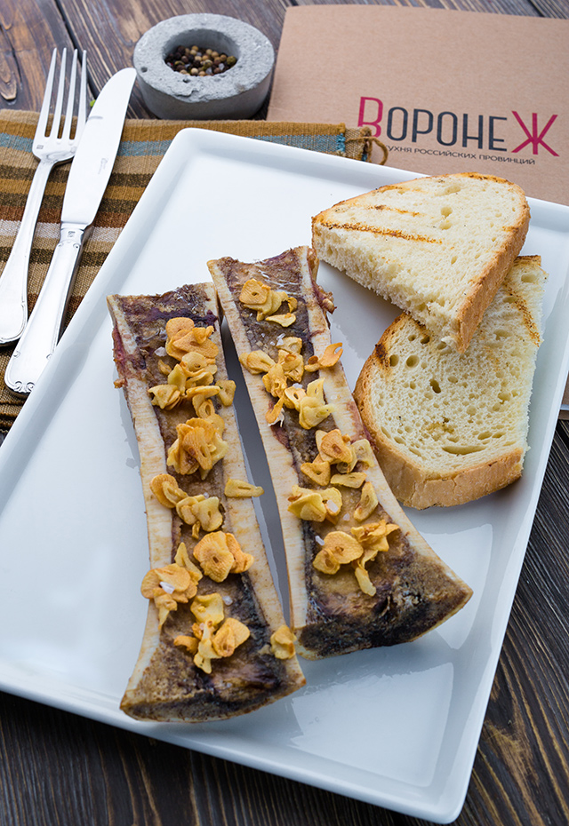 Назвать этот ресторан исключительно мясным — значит погрешить против правды. Собственно мясо занимает в меню всего лишь треть, на остальном пространстве резвятся пять видов устриц, креветки, гребешки, сибас, осетрина, блюда с крабом и морским ежом, наваристые супы: от ухи с самогоном (380 руб.) и нашего ответа французскому луковому супу, луковой похлебки с костромским сыром (220 руб.), до солянки (340 руб.) и домашней лапши с потрошками (250 руб.). Отличная перловка с белыми грибами (480 руб.), полба с раковыми шейками (380 руб.) — в другом ресторане Раппопорта, «Гранд кафе Dr. Живаго», ее готовят с пшенкой, фаршированная шейка костромской утки, потрошки, кожа цыпленка, жареный лук (580 руб.), патэ из кролика с говяжьим беконом (большая, кстати, редкость, этот бекон), запеченные мозговые кости (300 руб.) — кухня «Воронежа» шкварчит и пыхтит на все лады.
