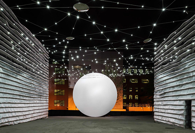 Как я уже говорил, этот проект стал своеобразным тестовым полигоном различных задумок и идей, которые мы давно хотели проверить в действии. На территории ЭМА встречаются и накладываются друг на друга два архитектурных и культурных слоя. Первый слой — дух старой Москвы, маленьких кривых переулков, руин и особняков. Второй — советский, с его верой в науку, электронику, будущее, со свойственной этому времени эстетикой. Мы решили добавить к этому палимпсесту еще один слой — современный: блестящий, временный, технологичный, театральный, слегка абсурдный. Мы затянули внешние поверхности серебряными стенами из фольги, повесили во дворе электрическое небо, поставили во двор искусственную Луну и вернули месту исторический футуристический логотип.
