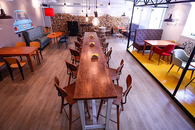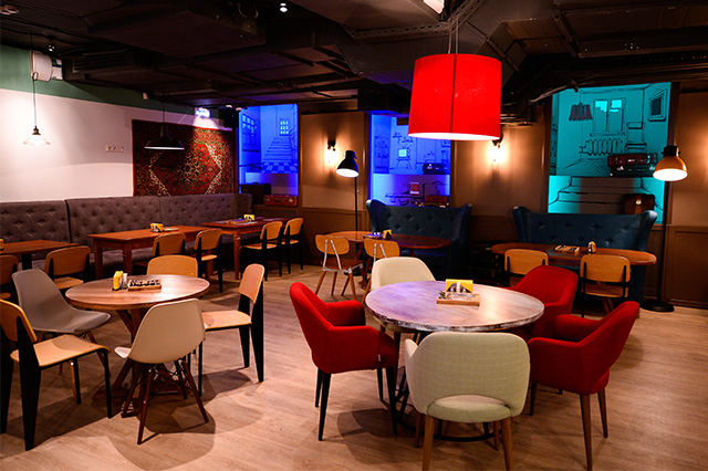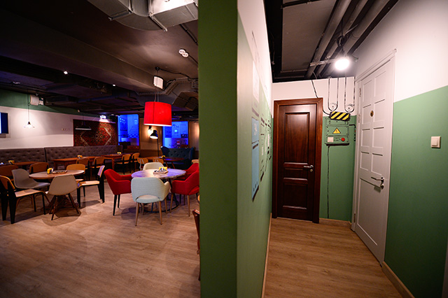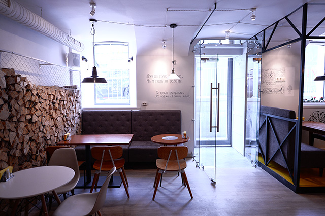 В интерьере обошлись без советской эклектики: серпов и молотов, плакатов в духе соцреализма, граненых стаканов, красных галстуков и нарочитой ностальгии по прошлому. Зато изящно обыграли мотивы народной вышивки, превратив ее в принты на стенах, кованые элементы лестниц и подкладку огромных абажуров над столами.