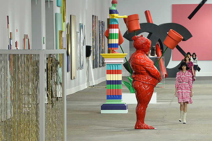Глава Дома Chanel Карл Лагерфельд создал 75 арт-объектов специально к показу своей весенне-летней коллекции в парижском Гран Пале (Grand Palais). Свои картины, скульптуры и инсталляции (как масштабные, так и скромные по размерам) — почти все с традиционными символами Chanel — модельер сотворил, вдохновляясь творчеством Василия Кандинского, Джексона Поллока, Класа Ольденбурга и Марселя Дюшана. Классическая стеганая поверхность, логотип Дома и Chanel №5 — особенно примечателен робот с флаконом духов в качестве тела — встречаются на каждом шагу. Настолько близок к искусству Карл Лагерфельд еще никогда не был.