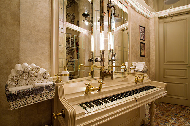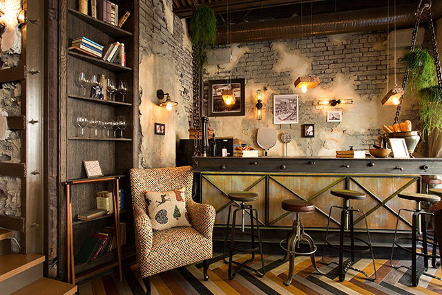 Мало найдется в Москве ресторанов, которые бы занимали целое здание. Старый, как и все выходящие фасадами на Покровку здания, но с умом перестроенный дом в новом своем платье похож на эксцентричную музыкантшу. Невероятно красивый паркет разных цветов в ее гостиной заставлен объемистыми креслами, из которых, если сядешь, нет никакого желания выбираться, столы парят в воздухе вверх ногами, а из пианино в туалете течет вода. Одним словом, интерьер в стиле «нонсенс» вызывает недоумение, но не отторжение: мало ли с какими чудачествами приходится нам встречаться.