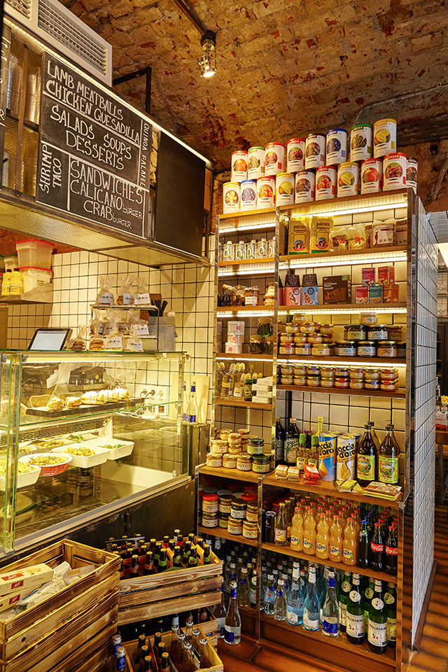 Карне Асада — стейк-стриплойн на гриле в соевом маринаде с кинзой — с мексиканскими картофельными оладьями и сладким кукурузным пюре (1 290 руб.) сражается за внимание публики с куриной тикка масалой (550 руб.) с хрустящим шалотом и басмати и тайским сибасом с гречневой лапшой и соусом нак чом (690 руб.). Тут-то и вскрывается секрет привлекательности Calicano для обитателей Патриков: пока адепты текс-мекса маринуют куриные крылышки для барбекю, тут вольно интерпретируют понасмотренную по всему миру классику быстрой и понятной еды. И вот уже уплетается за милую душу правильная до скуки индейка, приправленная в сэндвиче чесночным айоли и клюквенным чатни (490 руб.), а мексиканский суп с мясом кролика, чечевицей, кукурузой и кинзой (350 руб.) стал родным и понятным даже детям.