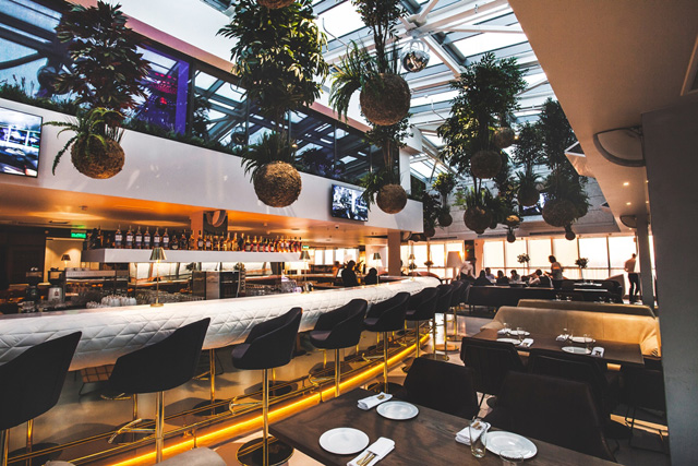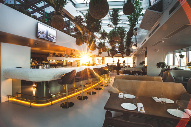 Сравнения с самым высоким рестораном столицы, как и с другим гастрономическим «высотником», White Rabbit, неизбежны, ведь сама стереометрия пентхауса задает законы жанра. Объем футуристического атриума разбавлен «подвисшими» в воздухе живыми деревьями, а круглые бары предназначены для кулинарных спектаклей (не просто подсмотрено в «Белом кролике», а выполнено тем же дизайнерским бюро).