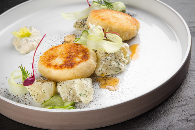 С полудня и до 17 часов в ресторане подают блюда обеденного меню. В нем больше закусок и супов, а тушеная телячья щека, пельмени со щукой и котлеты из судака выполняют роль основного блюда. Звучит простовато, но при внимательном разборе оказывается, что это не простачество, а осознанная позиция. Во-первых, нет смысла во время обеда поражать спешащих по делам едоков, во-вторых, в каждом из обеденных блюд есть акцент, который наскучившую мелодию превращает в хитовую аранжировку. Так, телячий язык-гриль оживляет окрошку (420 руб.), копченый картофель с творожным кремом — рулет из цыпленка, а жареное филе сельди (450 руб.) и вовсе солирует без всякой поддержки.