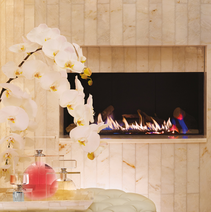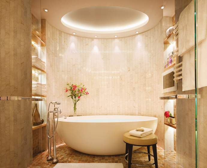 Двухэтажное пространство номера поделили прихожая с мраморной винтовой лестницей, ведущей на верхний уровень, кабинет с камином и тремя телеэкранами, главная спальня с собственной ванной и гардеробной комнатой, лаундж-зона, столовая, кухня, гостиная, собственный кабинет для СПА-процедур, терраса с удобными креслами и очагом для костра, а также вторая спальня с отдельной ванной и гардеробной комнатой. К слову, обе ванные комнаты отделаны натуральным мрамором и редким ониксом медового оттенка, а в ванной комнате главной спальни имеется камин.