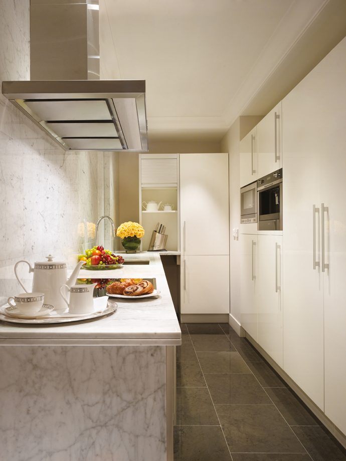 В прихожей центром притяжения взглядов является двухъярусная люстра, а в столовой обратите внимание - потолок, украшенный сусальным золотом. Из других предметов интерьера стоит отметить выполненный по специальному заказу телевизионный экран, похожий на зеркало и, конечно, комфортабельные кровати, матрасы для которых делает поставщик королевской семьи.