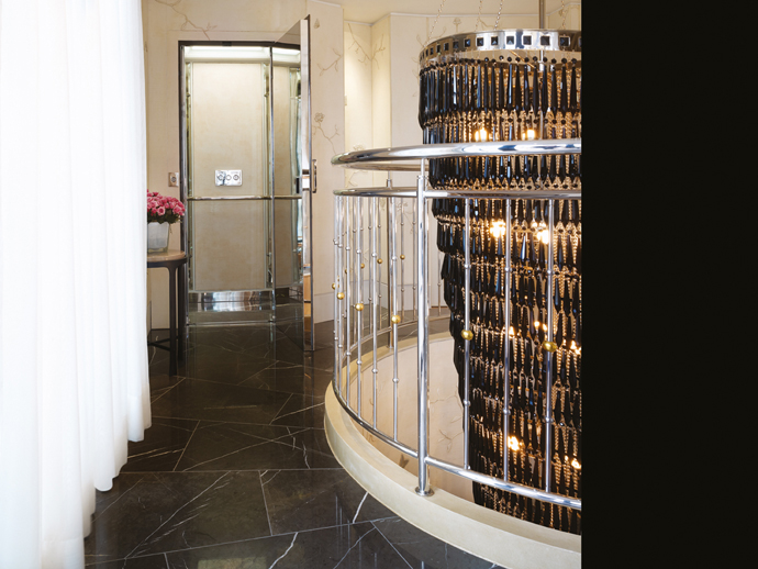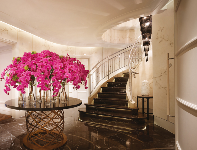 Особенно впечатляет наличие собственного лифта, который мгновенно доставит гостей из прихожей пентхауса на верхний уровень. Лобби номера в виде ротонды, как и лестница, отделано мрамором, а стены полукруглой обеденной зоны облицованы зеркалами. Полы в гостиной комнате покрыты паркетными досками из дуба, поверх которых уложен ковер. Благодаря мелким деталям в виде цветочных композиций, спокойных монохромных оттенков занавесок и постельного белья, в The Royal Penthouse царит атмосфера домашнего уюта и комфорта.