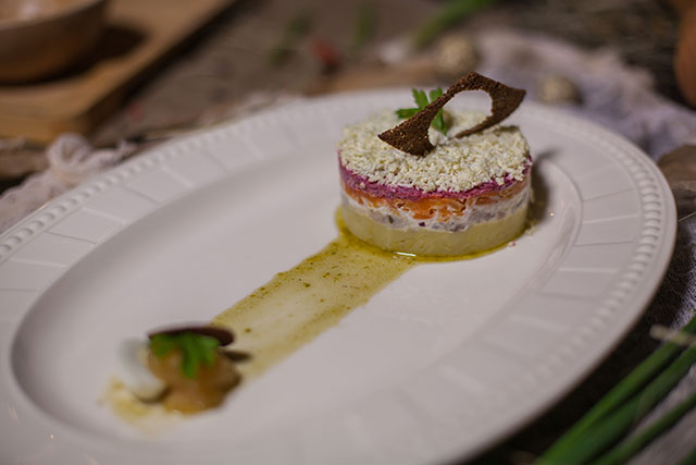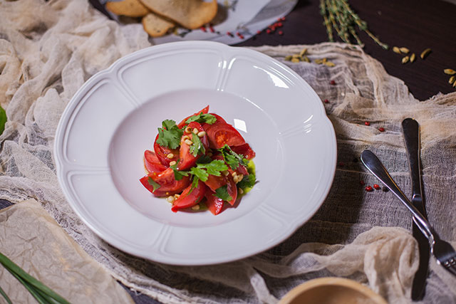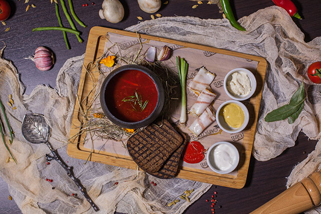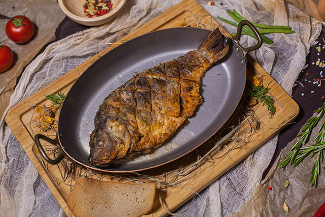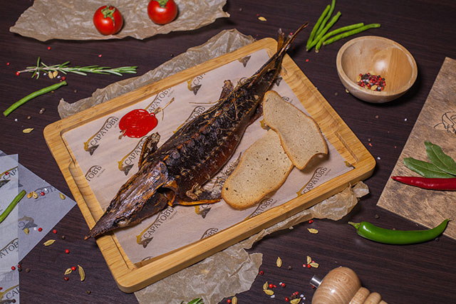 Самый важный персонаж здешнего меню — рыба. В обшитой берестой купели, похожей на циклопическую березовую колоду, плещутся раки, стерляди, карпы и караси. Их могут сварить, изжарить, потушить, запечь, приготовить на пару, подкоптить — любой каприз, в общем, а получается и вправду замечательно. Заливное делают из копченого сома (420 руб.), охлаждая его в крепком бульоне из лосося и стерляди без желатина. Такой студень не держит форму, поэтому его подают в банках. Копченого карпа кладут в шеф-салат (680 руб.) Его особенность — сложная сладко-пряная заправка из апельсинового фреша, имбиря и крем-майонеза, вступающая в непростые взаимоотношения с рыбой.