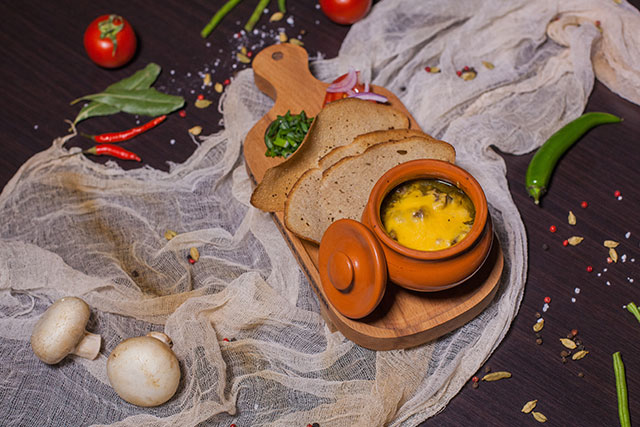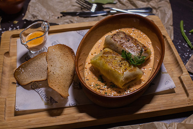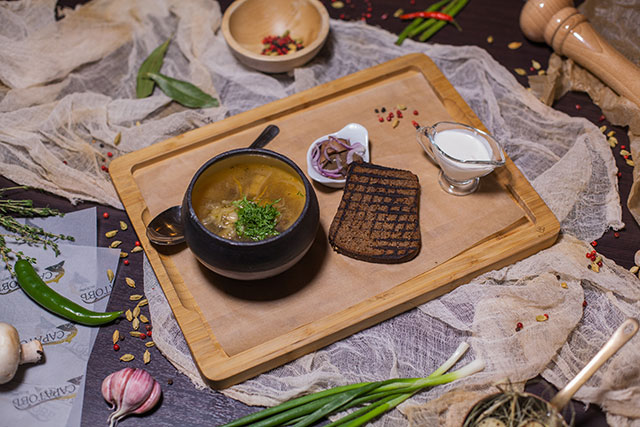 В остальном меню ресторана представляет собой плод сложной комбинации компромиссов, примиряющей коммерческие блюда, новомодные тренды и игру слов. «Саратов» похож на скатерть-самобранку из «Чародеев». Если помните, этот неодушевленный персонаж советского новогоднего мюзикла был горазд и на щедрое гостеприимство, и на близкую к сухости формальность. Так получается с варениками с печенью и картофелем (380 руб.). Их зачем-то подают в бульоне, и вареники доготавливаются уже на столе, расползаясь в лишней жидкости. В бульоне же, но уже по всем правилам, приносят и кундюбки с грибами и гречей (310 руб.). Оригинальности ради их катают на советских алюминиевых формах для пельменей. Начинки получается мало, а общее впечатление — скомканным.