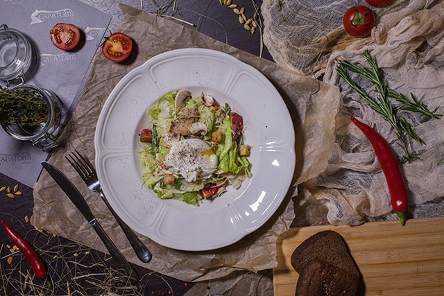 Владельцы «Саратова» говорят, что именно аудитория и их предпочтения подсказали им идею нового ресторана. Четыре зала на двух этажах с непременными полутемными уголками для приватных переговоров, декоративные решения с фольклорным оттенком (оцените встроенные в подножия столов матрешки), черно-белые фотопанно с изображением достопримечательностей города на Волге, полотняные дорожки на столах — все это превращает ресторан в место, где понятные даже иностранцам традиции хотят поженить с новомодными новациями.