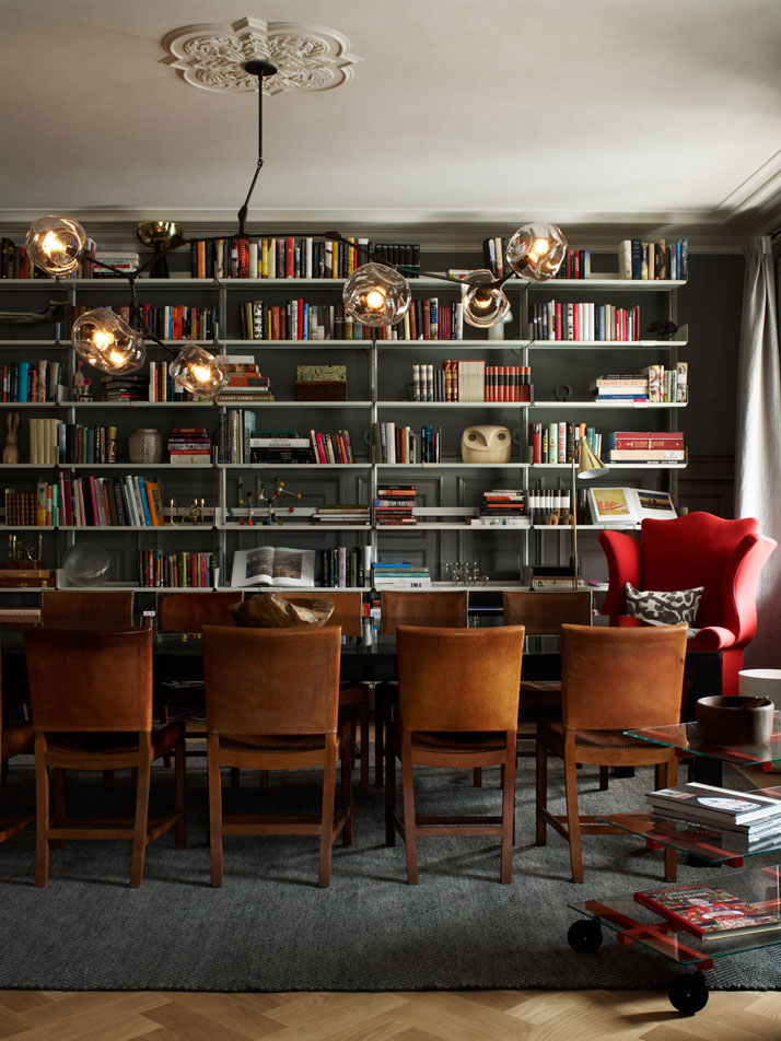 Если же у гостей Ett Hem возникнет желание уединится, то можно отправиться в библиотеку. Здесь находится большой стол, удобное кожаное кресло красного оттенка, несколько стульев, журнальный столик и, конечно, огромная коллекция книг на любой вкус.