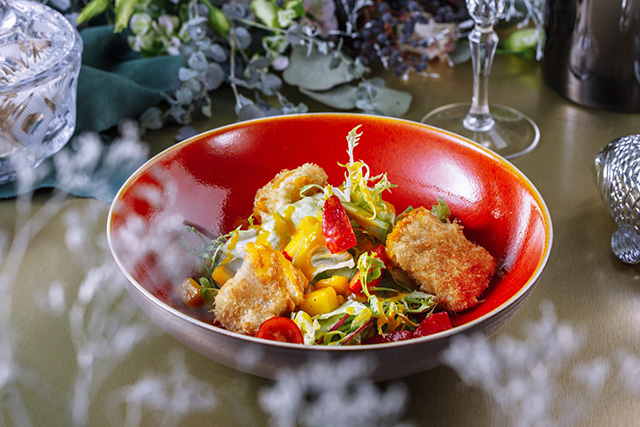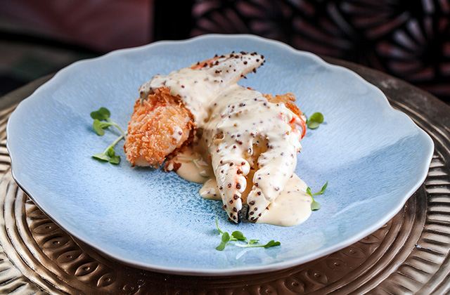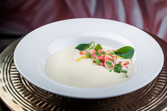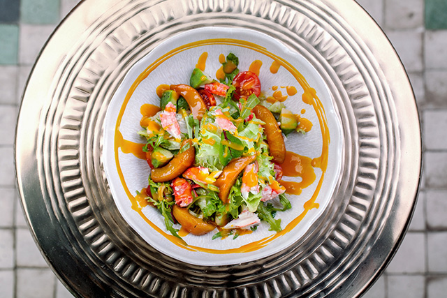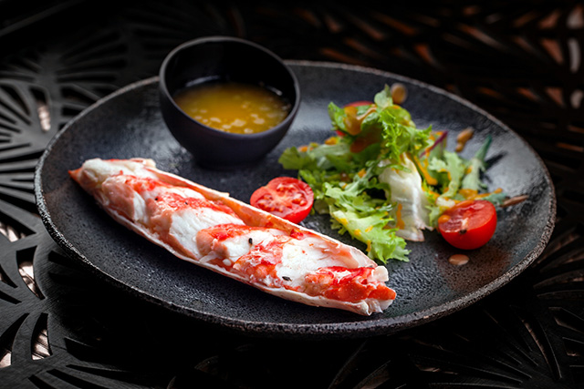 Ризотто с говяжьим тартаром (460 руб.) — тонко нюансированное сочетание «крудо» и «аль денте»; листья салата с крабом, персиком и манговым соусом (550 руб.) — живительная, освежающая летняя смесь, по колористике не уступающая вышеупомянутому витражу, а по настроению — требующая брюта; сливочно-кремовый чаудер-суп со щедрой россыпью креветок и лосося (430 руб.) для изящной девушки способен выступить полноценным жиро-белковым обедом; лососевый тартар (410 руб.), почти воздушный от мусса из авокадо, заботливо упакован в панцирь-трубочку из подсушенного бородинского хлеба; тыквенный суп (340 руб.) метафорично усыпан снегом и пеплом (из фуа-гра и оливок соответственно); целый крабовый раздел, с распростертыми фалангами (1 250 руб.), безобидными кулаками (980 руб.), нажористыми брускеттами (350 руб.) и ядреным сингапурским чили (1 250 руб.). Конечно же, шеф-повар, поработавший в нескольких ресторанах «Гинзы», не мог оставить аудиторию без борща (310 руб.), котлет (390 руб.) и цезаря (420 руб.). И то верно, ведь сырной эспумой сыт не будешь, а после завтрака с шампанским всегда наступает обед.