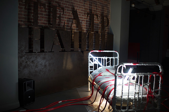 Сначала нам показывают театральный зал, который по замыслу будет превращен в выставочное пространство. Здесь разместится экспозиция Московского музея современного искусства, посвященная Шекспиру. Молодые художники Stain & ::vtol:: сделали для нее абстрактную постановку "Комедии ошибок", а Ирина Корина создала качели в виде шекспировской головы — правда, ничего этого пока на площадке нет. В данный момент здесь готовится интерактивная инсталляция группы "ЕлиКука", а Алина Гуткина проверяет, работает ли ее Shakespeare from the streets — сонеты, переложенные на биты и исполненные молодыми рэперами.
