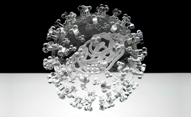 Работам британского художника Люка Жеррама позавидует любой стеклодув c многолетним стажем — столь искусны его прозрачные скульптуры, изображающие смертоносные вирусы. В поле зрения автора попали инфекционные агенты самых опасных заболеваний, таких как ВИЧ, свиной грипп, сальмонеллез, оспа и не только. Объединяя матовое и прозрачное стекло, Жеррам создает увеличенные в миллион раз модели вирусов, больше похожие на кристаллы или ювелирные украшения.